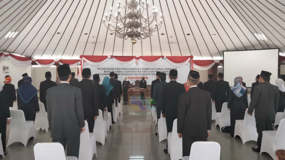 Total sebanyak 35 orang aparatur sipil negara (ASN) terdiri dari 17 Pejabat Administrator dan 18 Pejabat Pengawas, yang dilantik di Pendopo Malowopati Pemkab Bojonegoro. Senin (11/10/2021).