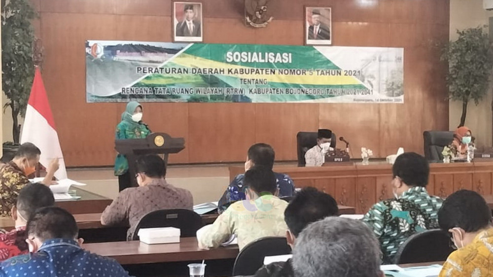 Bojonegoro - Pemerintah Kabupaten (Pemkab) Bojonegoro melalui Dinas Pekerjaan Umum Bina Marga dan Penataan Ruang (PUPR) Kabupaten Bojonegoro, pada Kamis (14/10/2021) menggelar sosialisasi Peraturan Daerah (Perda) Kabupaten Bojonegoro Nomor 5 tahun 2021 tentang Rencana Tata Ruang Wilayah (RTRW) Kabupaten Bojonegoro tahun 2021/2041.