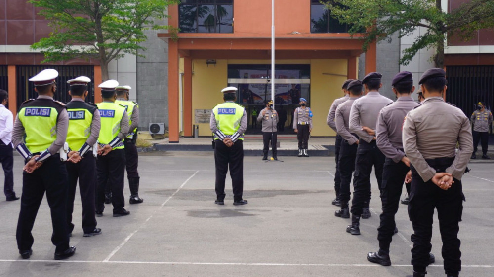 Kapolres Bojonegoro AKBP EG Pandia saat memimpin apel pagi di halaman Mapolres Bojonegoro Senin (18/10/2021). (foto: Dok Istimewa)