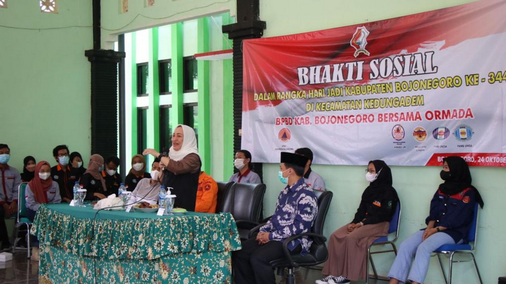 Bojonegoro - Bupati Bojonegoro Anna Mu'awanah saat beri sambutan dalam kegiatan bakti sosial di yang digelar Badan Penanggulangan Bencana Daerah (BPBD) Kabupaten Bojonegoro, bekerjasama dengan Organisasi Mahasiswa yang Kuliah di Luar Bojonegoro (Ormada), di Kecamatan Kedungadem, Minggu (24/10/2021), berharap kepada para mahasiswa yang sat ini kuliah di luar Bojonegoro, nantinya turut berperan dalam meuwujudkan Sumber Daya Manusia (SDM) yang unggul di Kabupaten Bojonegoro.