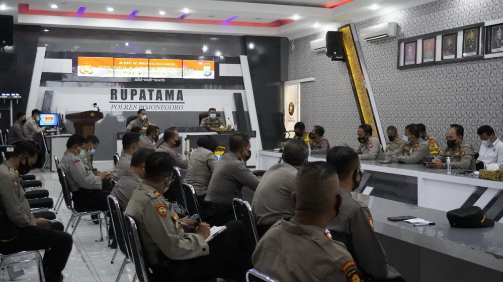Bojonegoro - Kapolres Bojonegoro AKBP EG Pandia pada Senin (25/10/2021) memimpin rapat analisa dan evaluasi (Anev) terkait kinerja Bagian, Satuan, Seksi, dan Polsek jajaran Polres Bojonegoro.