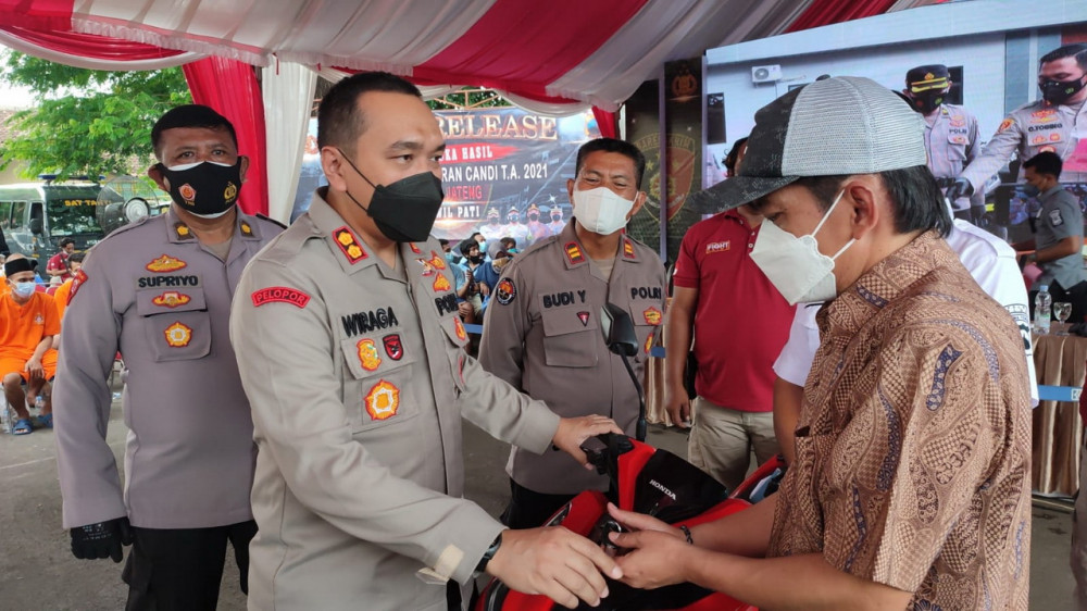 Kapolres Blora AKBP Wiraga Dimas Tama SIK, saat secara simbolis serahkan barang bukti sepeda motor, kepada pemiliknya, usai konferensi pers di Mapolres Pati. Selasa (02/11/2021) (foto: dok istimewa)