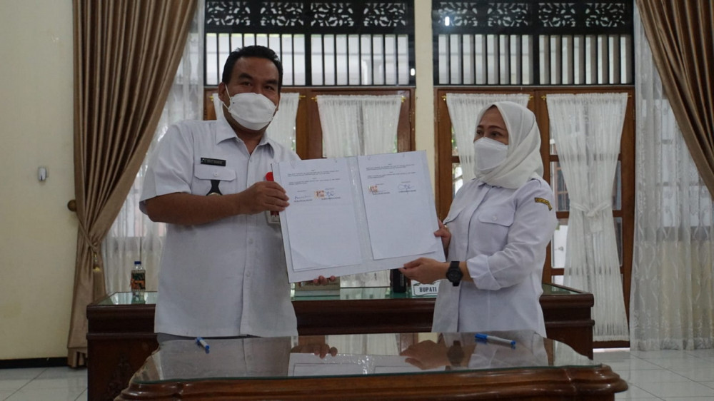 Bupati Blora Arief Rohman bersama Bupati Bojonegoro Anna Mu'awanah, saat tandatangani Naskah Perjanjian Hibah Daerah (NPHD) hibah tanah dari Pemkab Blora kepada Pemkab Bojonegoro. (foto: dok istimewa)