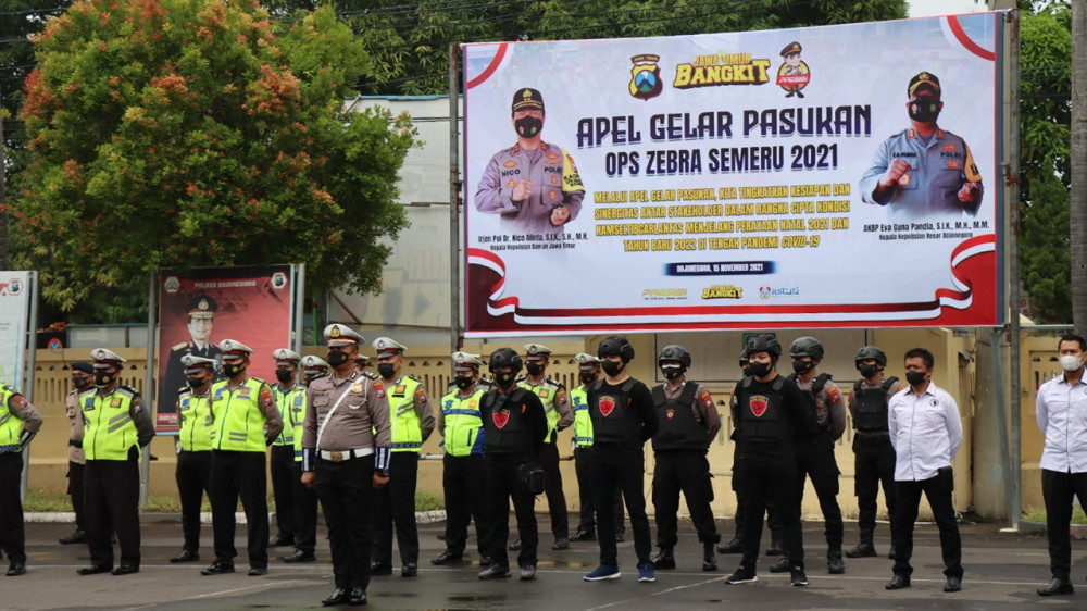Bojonegoro - Mengawali pelaksanaan Operasi Zebra Semeru 2021, Polres Bojonegoro pada Senin (15/11/2021), melaksanakan Apel Gelar Pasukan Operasi Zebra Semeru 2021 di halaman Mapolres Bojonegoro.