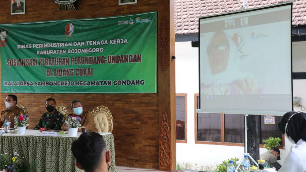 Bojonegoro - Pemerintah Kabupaten (Pemkab) Bojonegoro melalui Dinas Perindustrian dan Tenaga Kerja (Perinaker) Kabupaten Bojonegoro menggelar Sosialisasi Perundang-undangan Bidang Cukai dan Dana Bagi Hasil Cukai dan Hasil Tembakau (DBHCHT), di Kecamatan Gondang. Senin (15/12/2021).