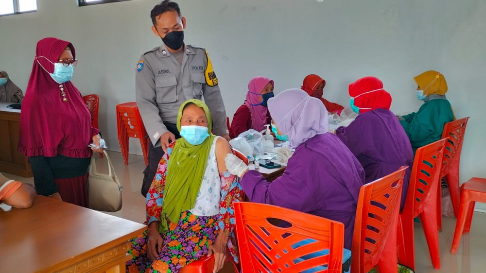 Bojonegoro - Semangat melayani anggota Polsek Sumberrejo, Polres Bojonegoro, kepada para lansia ditunjukkan saat kegiatan vaksinasi Kamis (18/11/2021) pagi.