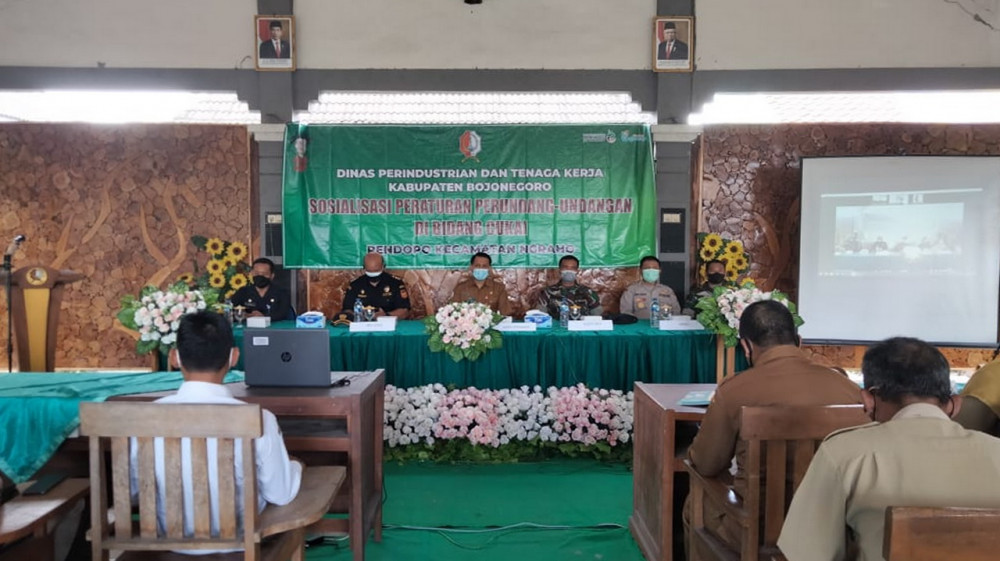 Bojonegoro - Pemerintah Kabupaten (Pemkab) Bojonegoro melalui Dinas Perindustrian dan Tenaga Kerja (Perinaker) Kabupaten Bojonegoro bersama Kantor Pengawasan dan Pelayanan Bea Cukai Bojonegoro, menggelar Sosialisasi Perundang-undangan Bidang Cukai dan Dana Bagi Hasil Cukai dan Hasil Tembakau (DBHCHT), di Kecamatan Ngraho. Selasa (23/11/2021).