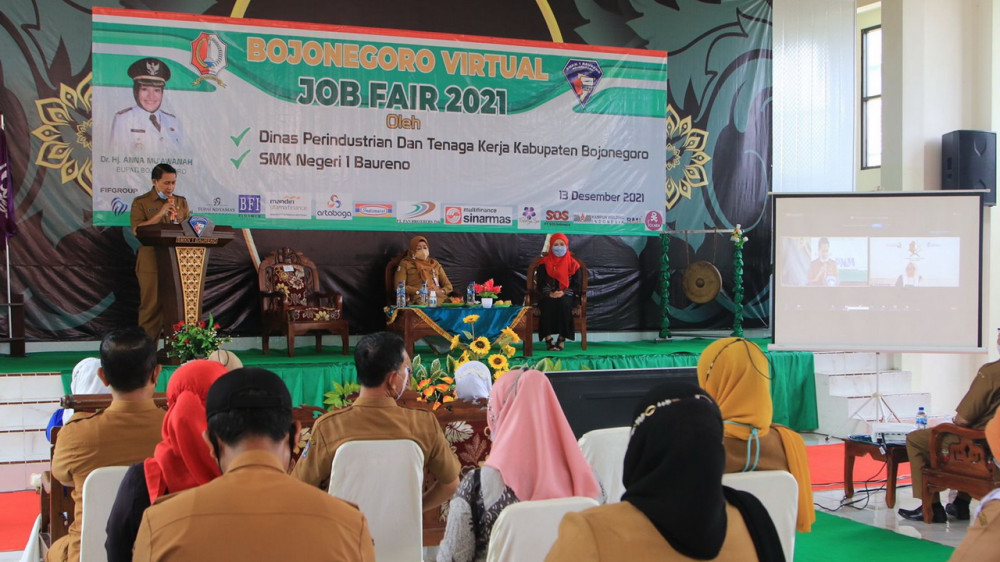 Bojonegoro -, Pemerintah Kabupaten (Pemkab) Bojonegoro, melalui Dinas Perindustrian dan Tenaga Kerja (Perinaker) Kabupaten Bojonegoro, kembali menggelar Bojonegoro Virtual Job Fair 2021, yang digelar selama dua hari, mulai tanggal 13 hingga 14 Desember 2021, di Hall SMK Negeri Baureno, Kabupaten Bojonegoro.