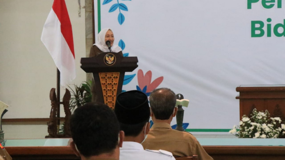 Bupati Bojonegoro Anna Mu'awanah saat beri sambutan usai serahkan piagam penghargaan Bidang Lingkungan Hidup Tahun 2021. Selasa (21/12/2021) (foto: dok istimewa)