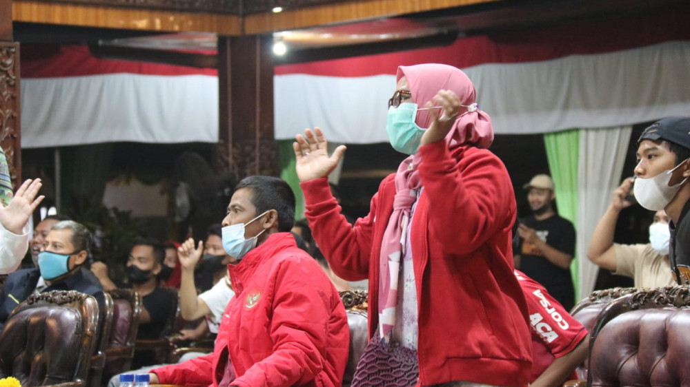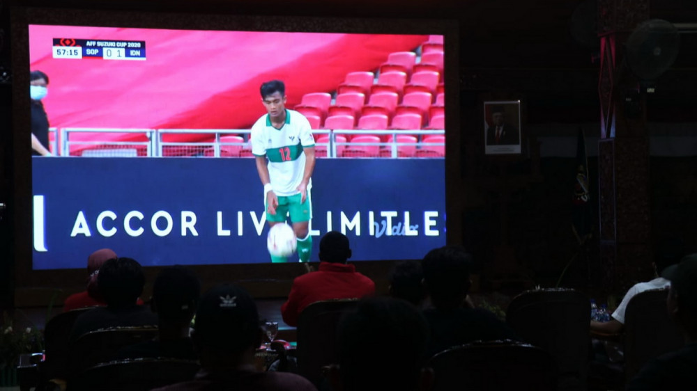Suasana Nonton Bareng (Nobar) pertandingan Timnas Indonesia melawan Singapura di Semifinal Leg Pertama Piala AFF 2020, di Pendopo Rumah Dinas Bupati Blora. Rabu (22/12/2021) (foto: priyo/beritabojonegoro)