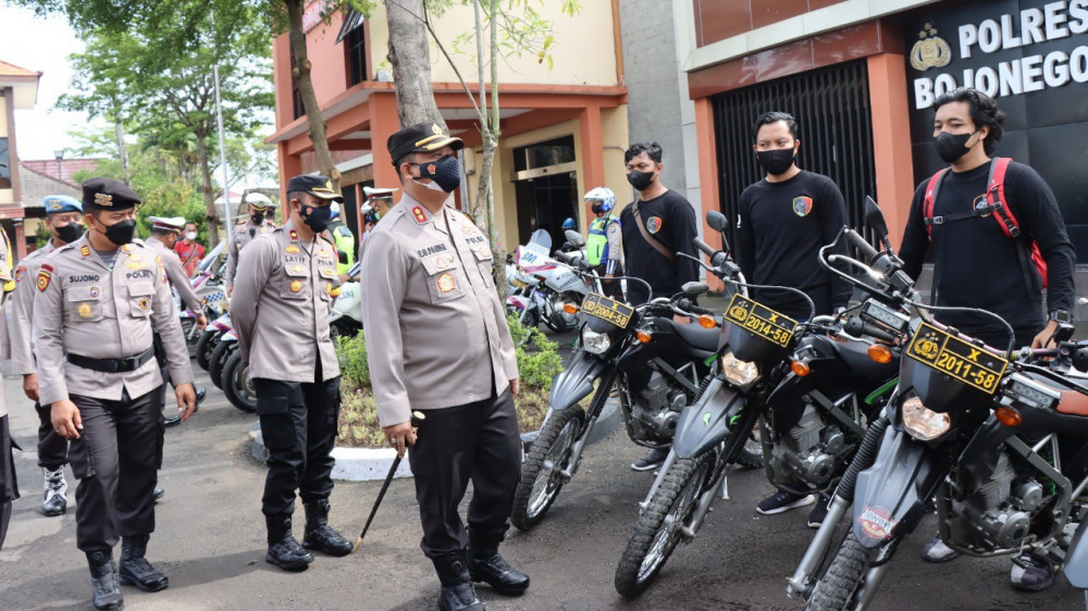 Bojonegoro - Jelang malam pergantian tahun baru 2022, Jumat (31/12/2021), Polres Bojonegoro menggelar pengecekan kendaraan bermotor (ranmor) dinas anggota, baik roda dua, roda empat, dan kendaraan taktis kepolisian lainnya, serta alat komunikasi anggota.