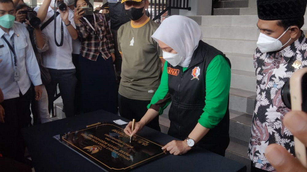 Bupati Bojonegoro Anna Mu'awanah, saat tanda tangani prasati sebagai tanda diresmikannya Pasar Wisata Bojonegoro. Jumat (07/01/2022) (foto: dan/beritabojonegoro)