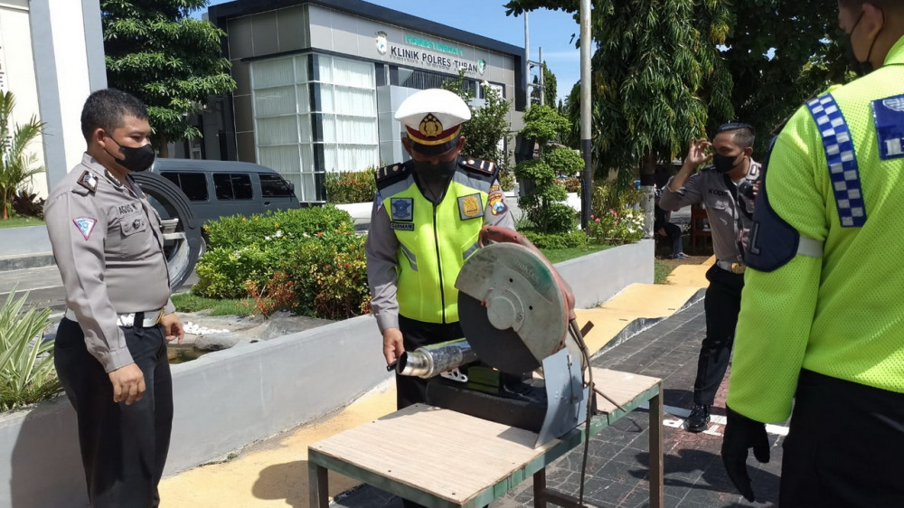 Petugas Sat Lantas Polres Tuban, saat memotong knalpot brong dari kendaraan yang terjaring razia saat malam tahun baru. Sabtu (08/01/2022) (foto: ayu/beritabojonegoro)