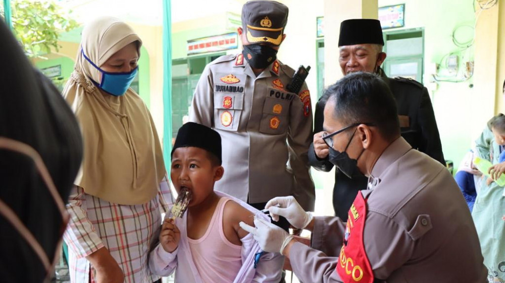 Bojonegoro - Kapolres Bojonegoro AKBP Muhammad, pada Selasa (11/01/2022) meninjau langsung kegiatan vaksinasi untuk anak usia 6-11 tahun di Pondok Pesantren Al-Rosyid, di Desa Ngumpakdalem, Kecamatan Dander, Kabupaten Bojonegoro.