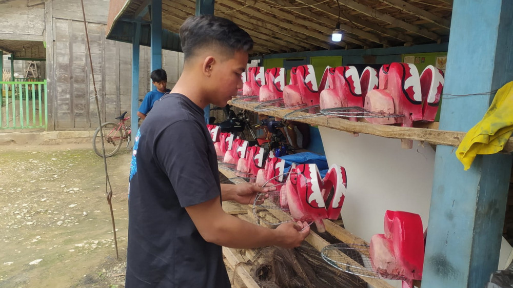 Taufik yang biasa tampil di atas panggung bersama teman-temennya beralih profesi membuat kerajinan barongan berbahan kayu yang ada di sekitar desanya.
