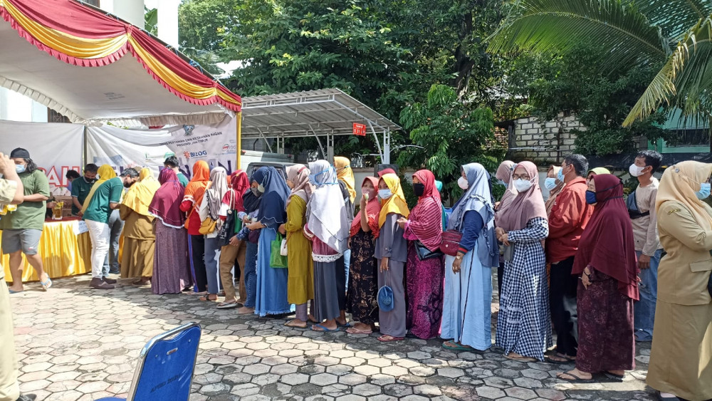 Warga terlihat mulai antre sejak pukul 07.00 WIB, sementara bazar baru mulai dibuka pukul 08.00 WIB. Dan pada pukul 10.00 WIB, sebanyak 3.000 liter minyak goreng murah yang disediakan panitia ludes terjual.