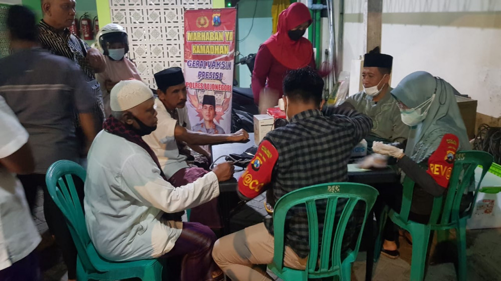 “Hari ini kita menggelar gerai vaksinasi Presisi di Masjid Agung Darussalam Bojonegoro. Vaksinasi dilaksanakan setelah shalat tarawih. Polres Bojonegoro akan terus menggelar gerai vaksinasi selama bulan Ramadhan sehingga percepatan vaksinasi untuk membentuk herd immunity,” ucap Kapolres Bojonegoro.