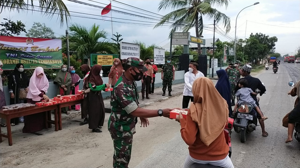 "Dengan bagi-bagi takjil ini aparat Koramil Tambakboyo agar lebih mendekatkan kepada masyarakat dengan kepedulian dan berempati," ucap Letda Inf Sunaryo.