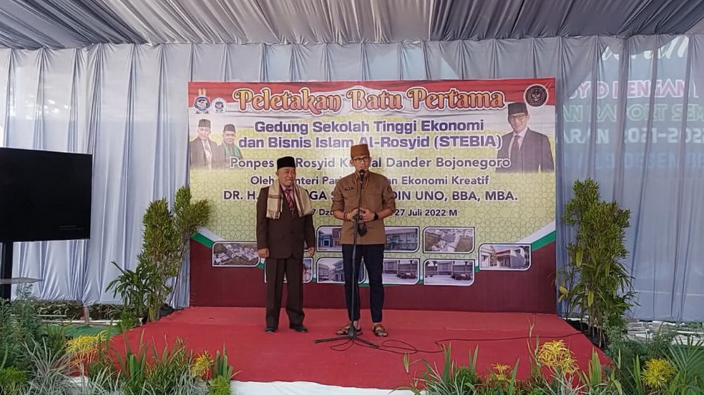 Bojonegoro - Di sela-sela kunjungannya di Kabupaten Bojonegoro, Rabu (27/07/2022), Menteri Pariwisata dan Ekonomi Kreatif, Sandiaga Uno, laksanakan peletakan batu pertama dimulainya pembangunan Sekolah Tinggi Ekonomi dan Bisnis Islam Al-Rosyid (STEBIA), dan meresmikan Sentra Ekonomi Kreatif berbasis pesantren di Pondok Pesantren (Ponpes) Al-Rosyid, Bojonegoro.