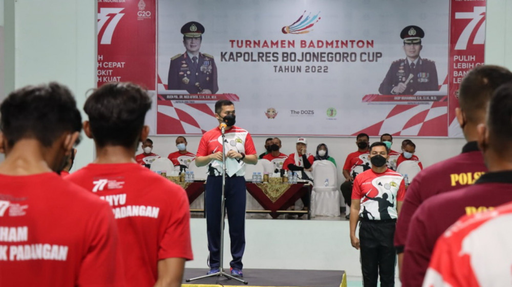 Kapolres Bojonegoro, AKBP Muhammad dalam sambutannya mengucapkan terima kasih kepada Forum Komunikasi Pimpinan Daerah (Forkopimda) Bojonegoro dan semua pihak yang turut mendukung terselenggaranya Turnamen Badminton Kapolres Bojonegoro Cup 2022.