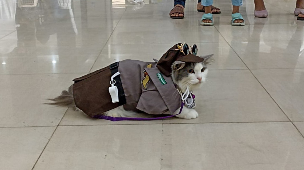 Salah satu kucing peserta kontes (fashion show) di Tuban, yang mengenakan busana Polwan. (foto: dok istimewa)