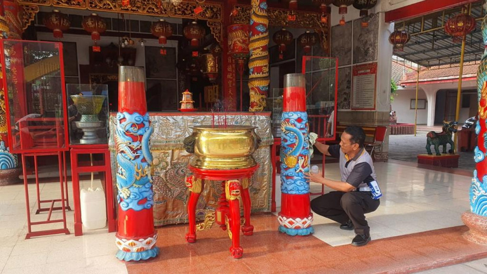 Anggota Sat Lantas Polres Bojonegoro saat menggelar bakti sosial (Baksos) Religi, membersihkan Kelenteng Hok Swie Bio, di Kota Bojonegoro. Rabu (14/09/2022) (foto: humas polres bojonegoro)