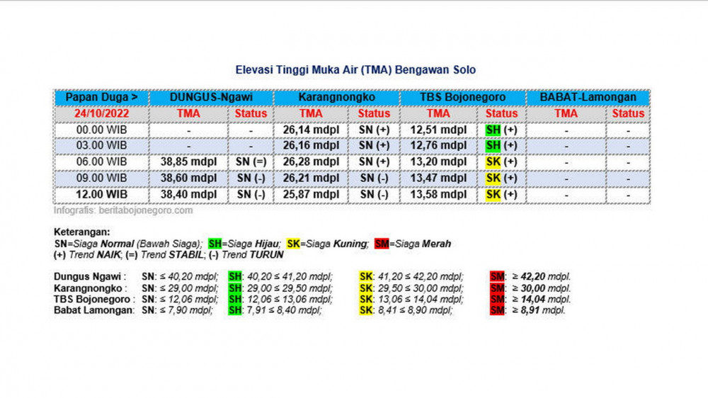 Berikut ini update status TMA Bengawan Solo, yang diterima media ini dari BPBD Bojonegoro, untuk tanggal 24 Oktober 2022, hingga pukul 12.00 WIB.