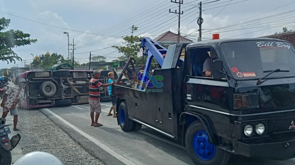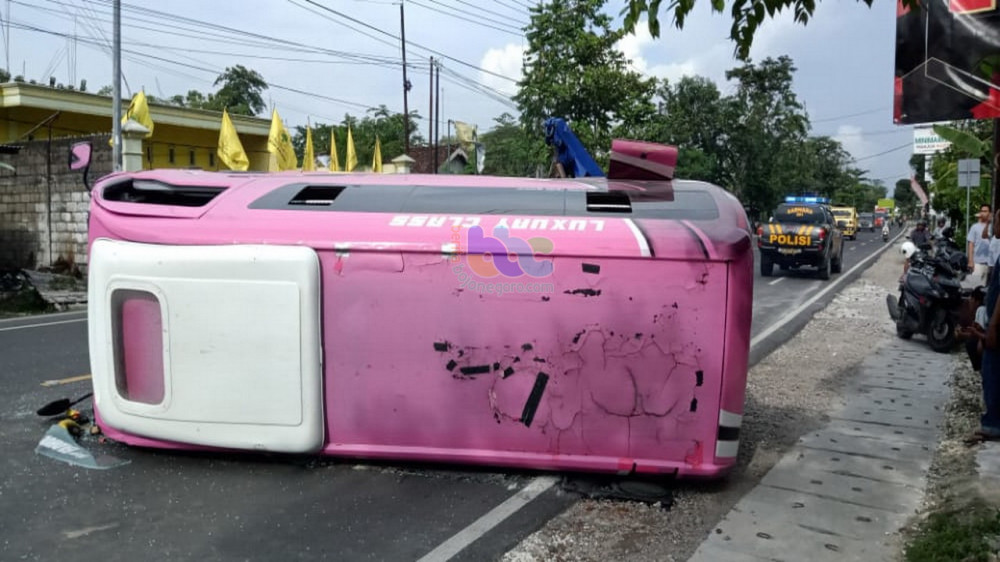 Kendaraan Isuzu Elf berpenumpang 16 orang, yang usai melaksanakan ziarah dari Pondok Pesantren (Ponpes) Lirboyo, Kediri, dan Pondok Pesantren (Ponpes) Tebu Ireng, Jombang, tiba-tiba oleng hingga terguling di badan jalan.