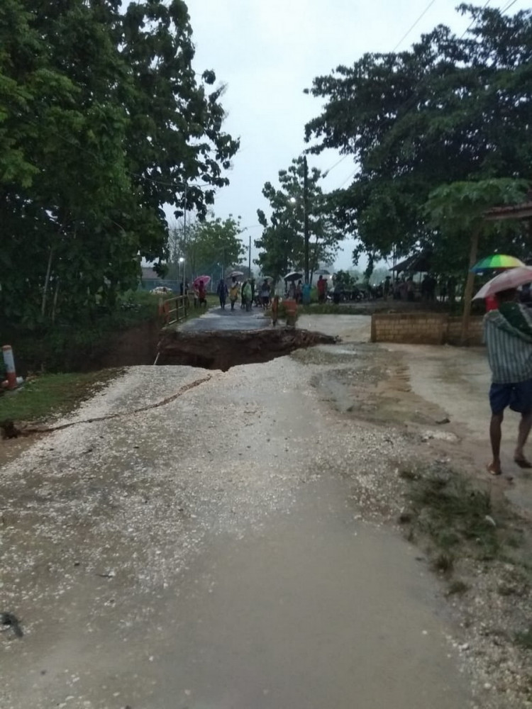 "Hujan deras sejak pukul 15.30 WIB tadi, karena deras, sekira pukul 16.00 WIB debit air naik hingga mengakibatkan bahu jalan tergerus yang mengakibatkan jalan penghubung terputus, " jelasnya selasa (29/11/2022).