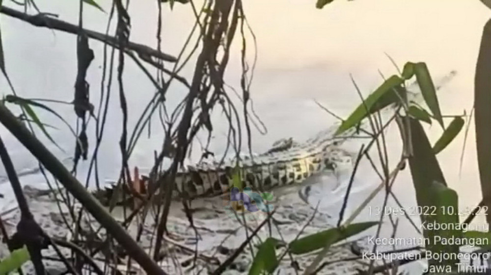 Bojonegoro - Seekor buaya kembali muncul di tepian Sungai Bengawan Solo, di Desa Kebonagung RT 007 RW 003, Kecamatan Padangan, Kabupaten Bojonegoro, Jawa Timur, Selasa (13/12/2022).