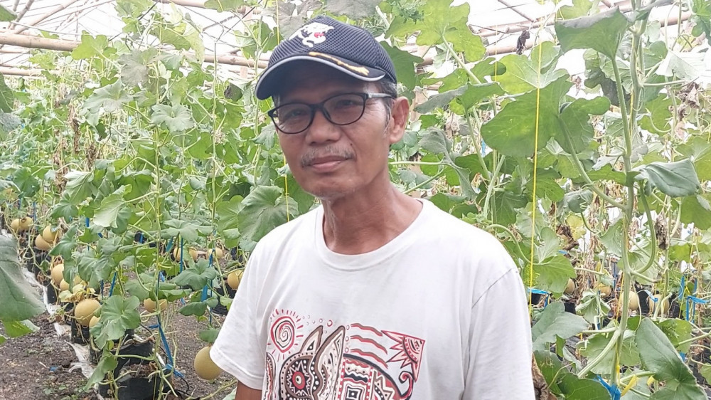 Petani yang satu ini baru pertama kali mencoba budidaya tanaman melon di dalam greenhouse dan kini hasilnya telah mulai ia rasakan.