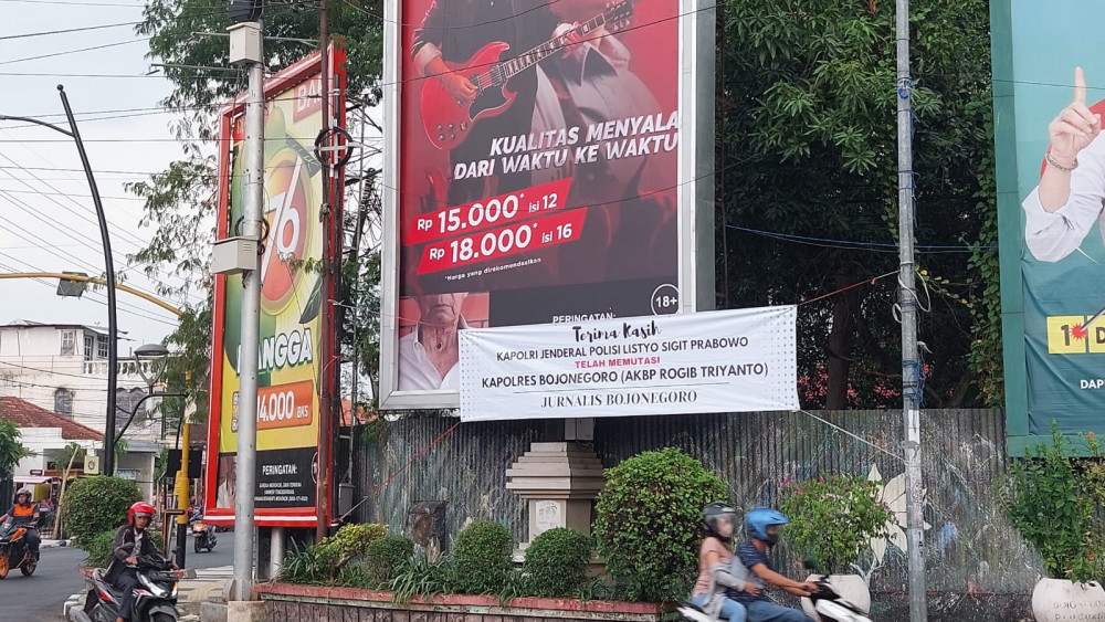 Sebuah spanduk yang dipasang oleh Jurnalis Bojonegoro di Perempatan Mbombok, Bojonegoro Kota. Senin (18/12/2023). (Aset: Imam/beritabojonegoro)