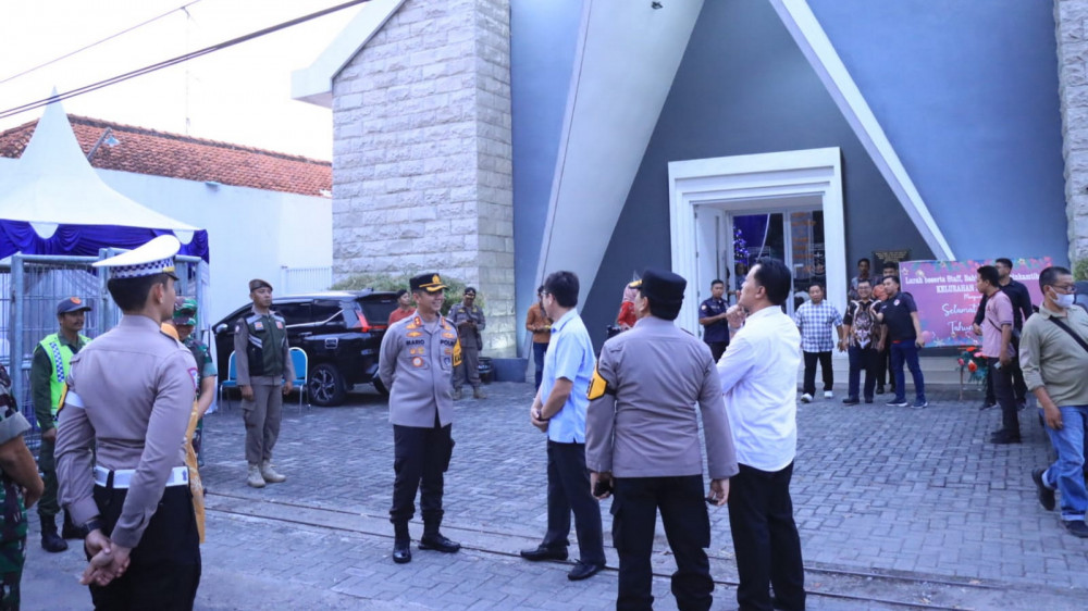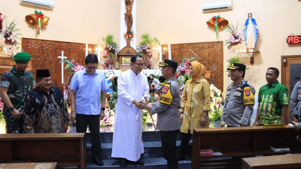 Bojonegoro - Kapolres Bojonegoro, AKBP Mario Prahatinto, bersama Pj Bupati Adriyanto, Dandim Letkol CZI Arief Rochman Hakim¸didampingi Sekretaris Daerah (Sekda) Bojonegoro Nurul Azizah, dan Ketua Forum Kerukunan Umat Beragama (FKUB) KH Tamam Syaifuddin, pada Minggu (24/12/2023), kunjungi sejumlah gereja yang ada di dalam Kota Bojonegoro.