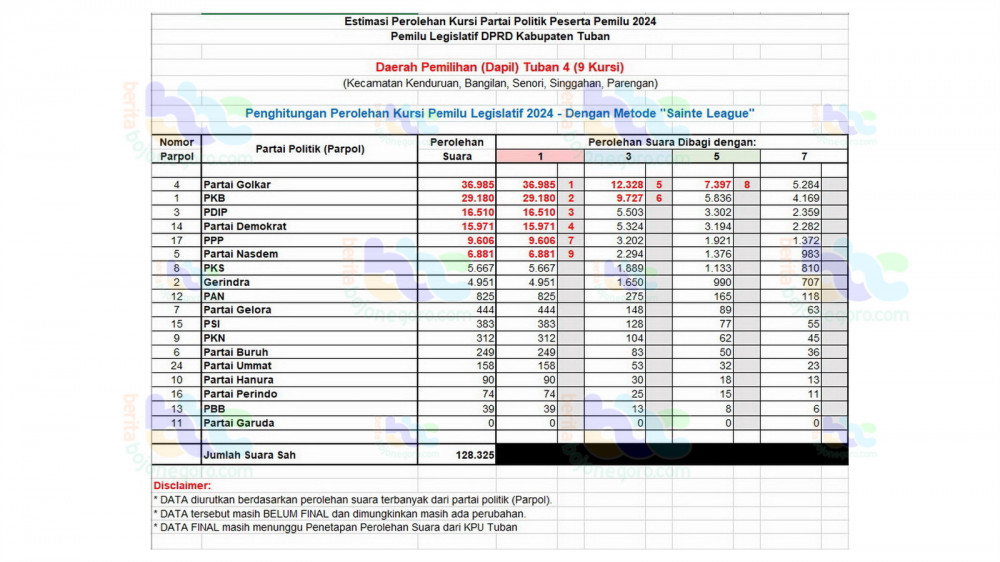 Untuk diketahui, berdasarkan rekapitulasi perolehan suara masing-masing partai politik (Parpol) dalam Pemilu 2024, khususnya untuk Pemilu Calon Anggota Legislatif DPRD Kabupaten Tuban, Partai Golkar diperkirakan akan memperoleh 20 kursi; disusul PKB diperkirakan akan memperoleh 11 kursi; Kemudian PDIP diperkirakan akan memperoleh 5 kursi; Kemudian Partai Gerindra dan Partai Nasdem masing-masing diperkirakan akan memperoleh 4 kursi.