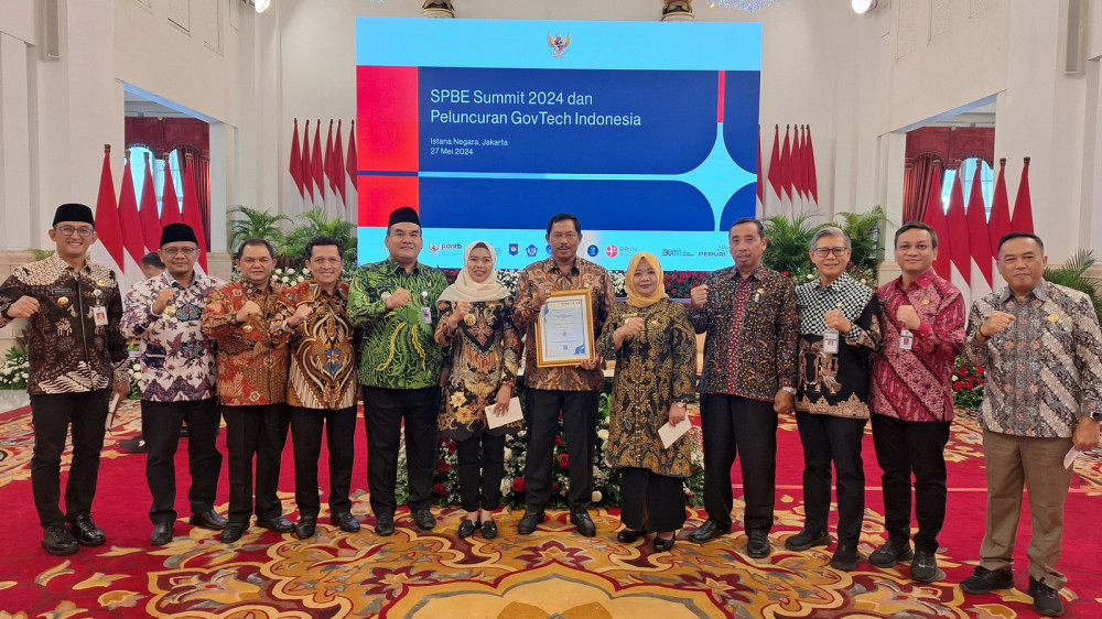 Bupati H Arief Rohman hadir dengan mengenakan pakaian batik lengan panjang nuansa hijau, berpeci dan duduk sejajar dengan para bupati dan wali kota lainnya yang masuk daerah pelaksana SPBE terbaik di ruang tengah Istana Negara.