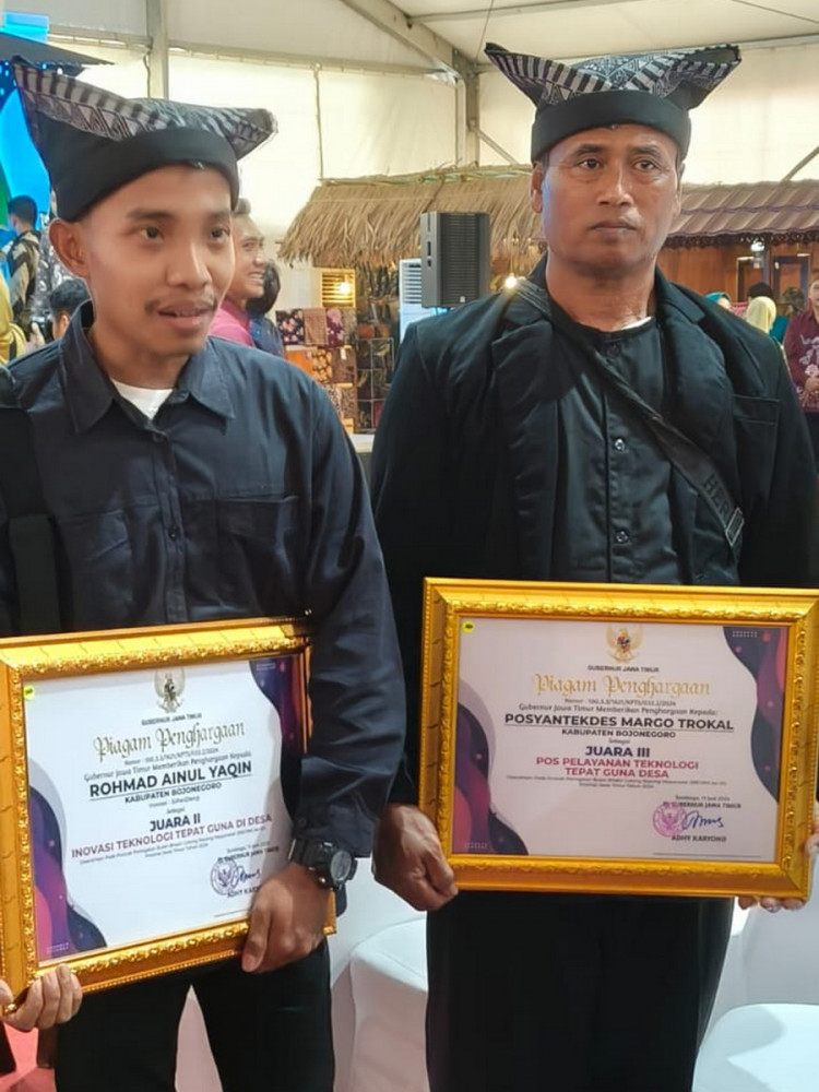 Penghargaan tesebut masing-masing diraih oleh Desa Pajeng Kecamatan Gondang Kabupaten Bojonegoro, sebagai juara kedua dalan kategori desa yang melaksanakan gotong royong. Penghargaan juga diberikan kepada Rohmad Ainul Yaqin asal Kecamatan Margomulyo yang meraih juara kedua inovasi teknologi tepat guna, dan penghargaan ketiga diraih Posyantekdes Margo Trokal, Desa Margomulyo, Kecamatan Margomulyo yang meraih juara ketiga Pos Pelayanan Teknologi Tepat Guna.