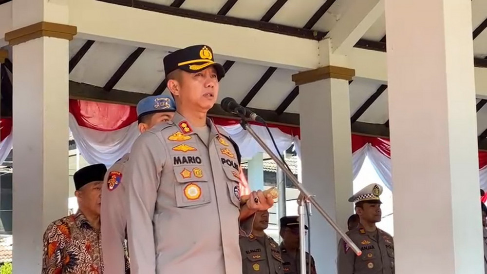 Kapolres Bojonegoro AKBP Mario Prahatinto saat pimpin Apel Gelar Pasukan yang dirangkai dengan Peragaan Sispamkota pengamanan Pilkada 2024 di Alun-alun Bojonegoro. Senin (19/08/2024). (Aset: Istimewa)