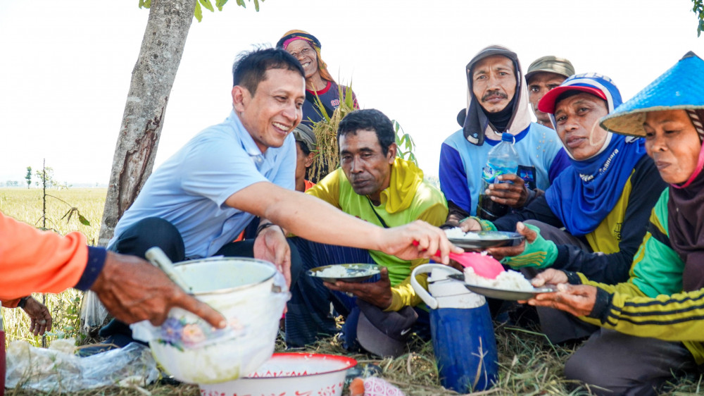 Kedatangan Bacabup Setyo Wahono mendapat sambutan hangat dari para petani. Bacabup asli Bojonegoro dari Desa Dolokgede, Kecamatan Tambakrejo ini usai panen raya juga makan bersama petani di area persawahan.