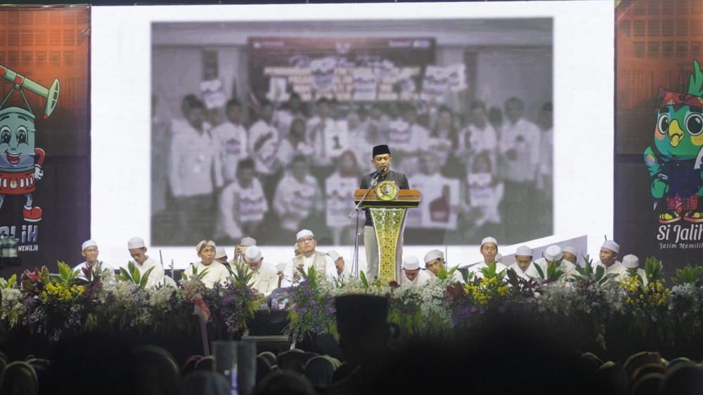 Ketua KPU Bojonegoro, Robby Adi Perwira, saat beri sambutan dalam acara KPU Bersholawat dalam rangka Deklarasi Kampanye Damai. Selasa malam (24/09/2024). Aset: Istimewa)