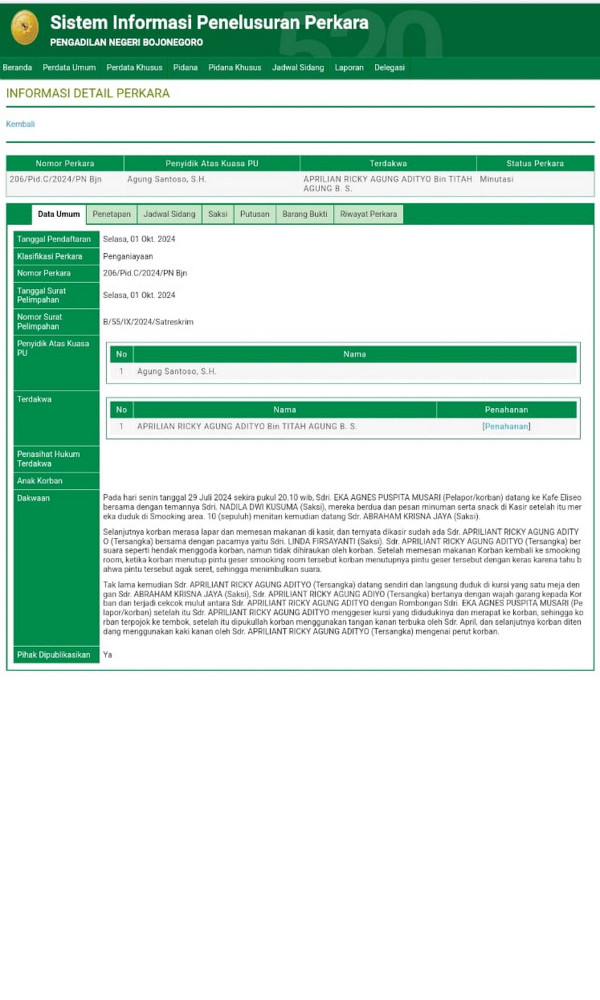 Bojonegoro - Kasus dugaan tindak pidana penganiayaan yang dilakukan seorang pemuda berinisial AP (24), pemilik kafe yang berlokasi di Jalan Meliwis Putih, turut Kelurahan Ngrowo, Kecamatan Bojonegoro Kota, Kabupaten Bojonegoro, terhadap seorang remaja putri berinisial AG (18), warga Kecamatan Dander, Kabupaten Bojonegoro, pada Selasa (01/10/2024) telah disidangkan.