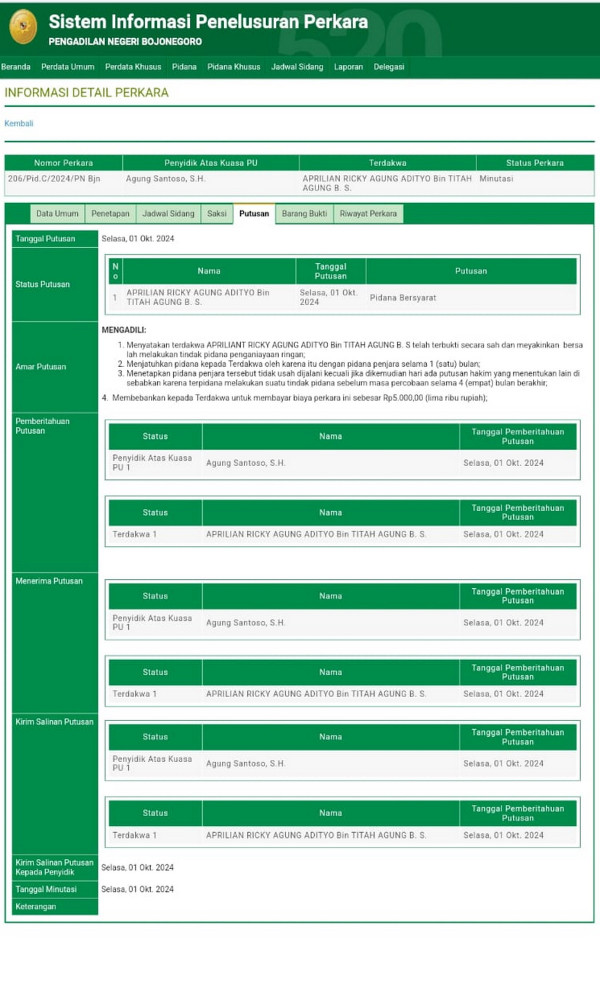 Pelaksanaan sidang perkara tersebut disampaikan melalui laman Sistem Informasi Penelusuran Perkara (SIPP) Pengadilan Negeri (PN) Bojonegoro, dengan Nomor Perkara 206/Pid.C/2024/PN Bjn.