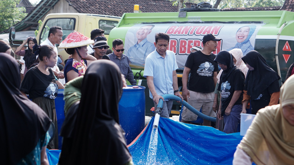 Ilustrasi: Calon Bupati Bojonegoro, Setyo Wahono saat membagikan air bersih kepada warga yang mengalami krisis air bersih. (Aset: Istimewa)