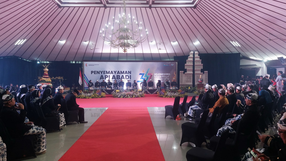 Bojonegoro - Penjabat (Pj) Bupati Bojonegoro Adriyanto, didampingi Ketua DPRD Abdulloh Umar, bersama jajaran Forkopimda Bojonegoro laksanakan Penyemayaman Api Abadi, di tempat “persemayaman” yang telah disiapkan Pendopo Malowopati Pemkab Bojonegoro. Sabtu malam (19/10/2024)