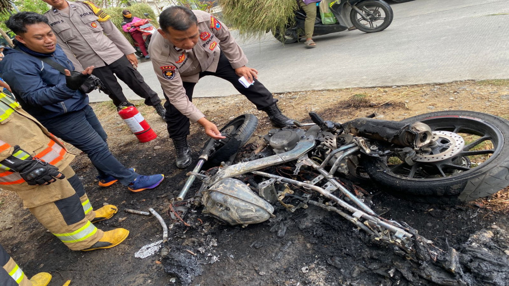 Bojonegoro - Satu unit sepeda motor, pada Senin (04/11/2024) sekitar pukul 11.10 WIB, terbakar di jalan poros desa turut wilayah Desa Sumberejo, Kecamatan Trucuk, Kabupaten Bojonegoro, Jawa Timur.