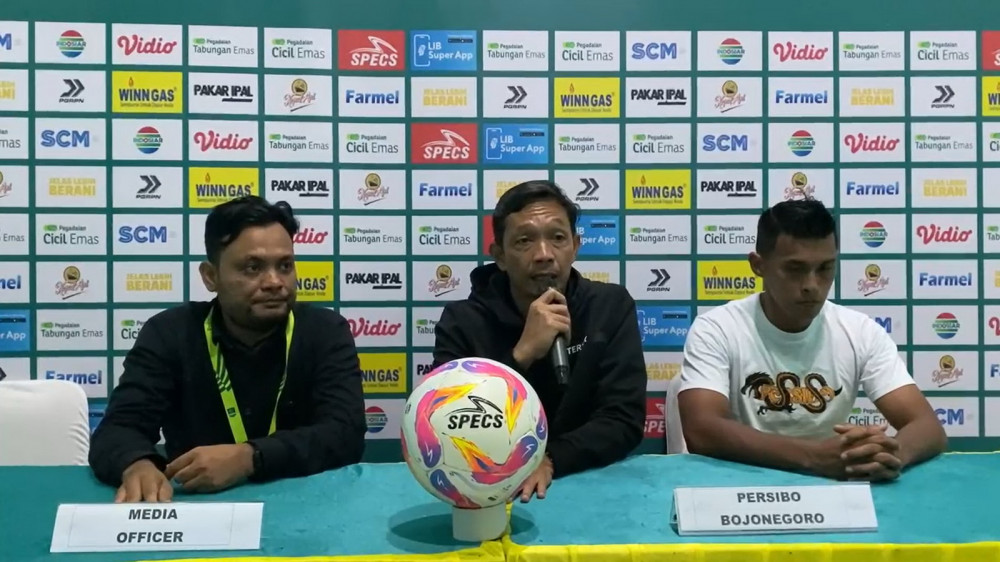 Pelatih Kepala Persibo Bojonegoro, Kahudi Wahyu Widodo (tengah) saat konferensi pers usai pertandingan melawan Persipura Jayapura, di Stadion Letjen H Soedirman Bojonegoro, Minggu (01/12/2024) (Aset: Istimewa)