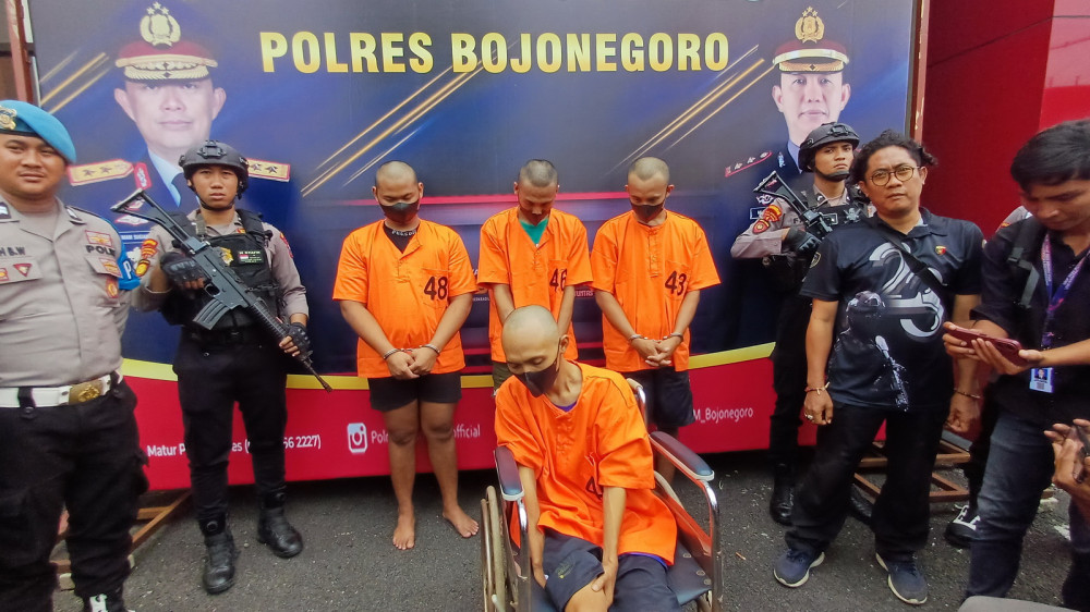 Pelaku pencurian HP dan Laptop (depan/dudun di kursi roda) saat dihadirkan dalam konferensi pers di Mapolres Bojonegoro. Jumat (10/01/2025). (Aset: Imam Nurcahyo/BeritaBojonegoro)