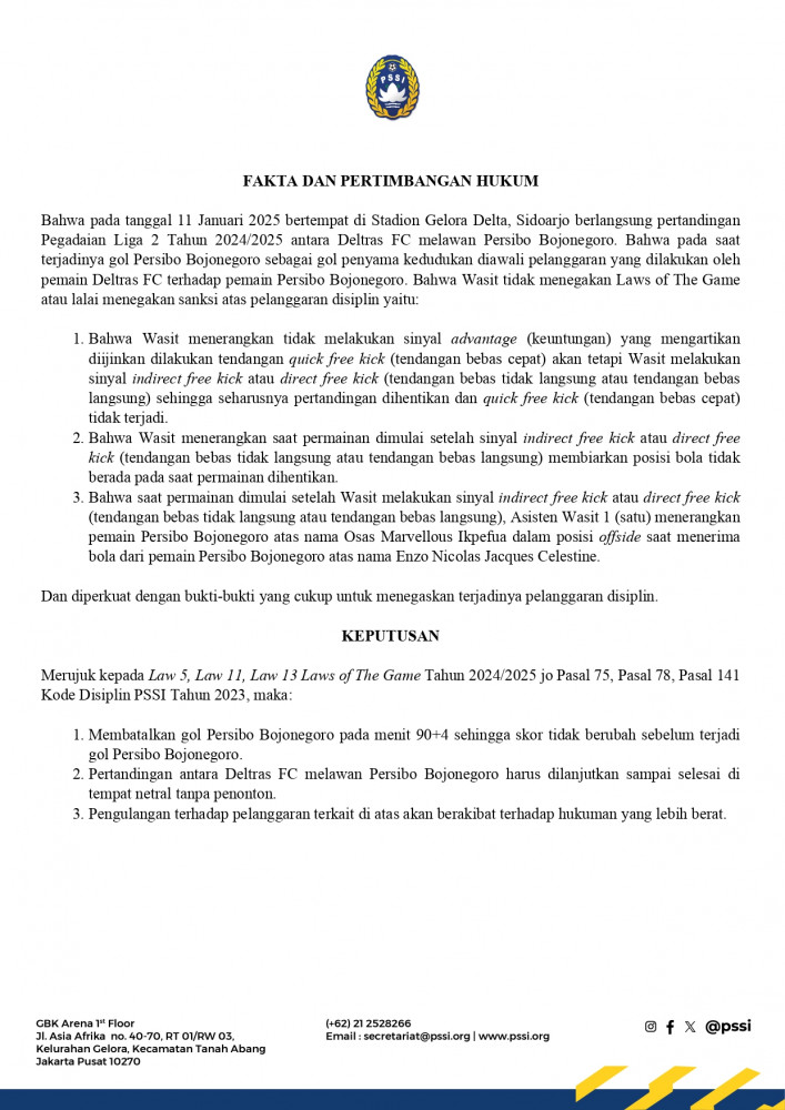 Keputusan tersebut tertuang dalam Surat Keputusan Nomor: 109/L2/SK/KD-PSSI/I/2025, tertanggal 12 Januari 2025, terkait Koreksi Keputusan Wasit dalam Pertandingan Deltras FC vs Persibo Bojonegoro tanggal 11 Januari 2025 Pegadaian Liga 2 2024/2025.