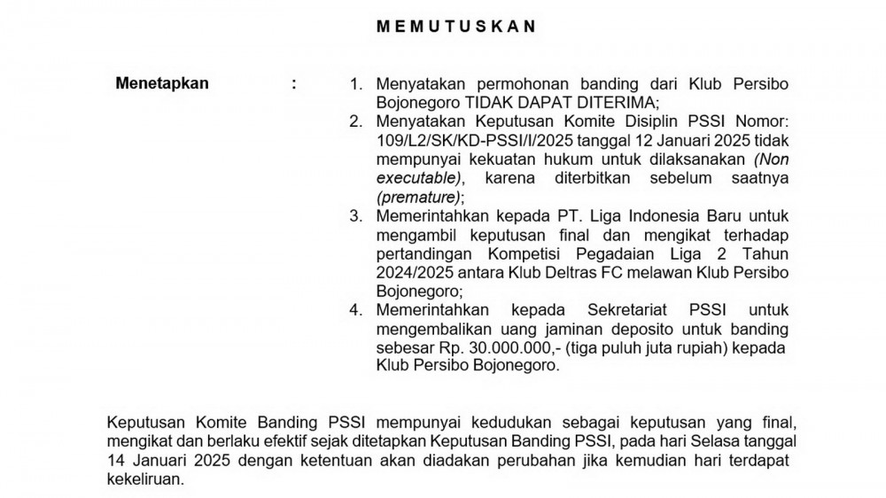 Bojonegoro - Komisi Banding (Komding) Persatuan Sepakbola Seluruh Indonesia (PSSI), menyatakan menolak permohonan banding dari Persibo Bojonegoro, namun juga menyatakan bahwa Keputusan Komite Disiplin (Komdis) PSSI Nomor 109/L2/SK/KD-PSSI/I/2025 tanggal 12 Januari 2025 tidak mempunyai kekuatan hukum untuk dilaksanakan (non executable), karena diterbitkan sebelum saatnya (premature).