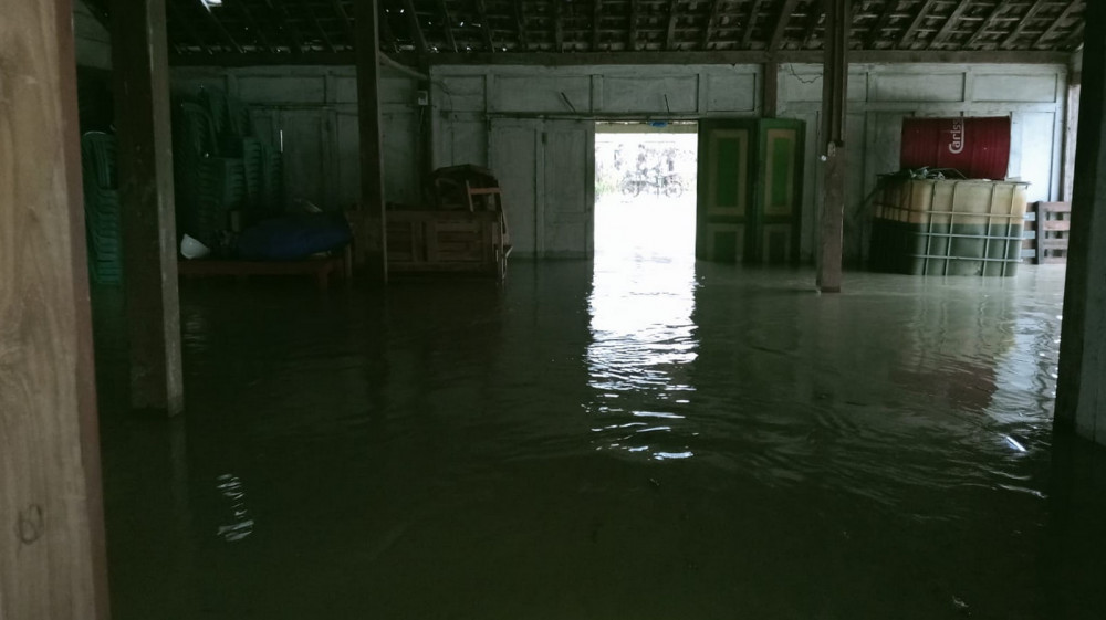 Rumah warga Desa Bobol, Kecamatan Sekar, Kabupaten Bojonegoro, Jawa Timur yang tergenang luapan air akibat banjir bandang. Senin sore (27/01/2025) (Aset: Istimewa)