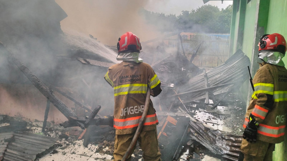 Petugas saat lakukan pemadaman kebakaran gudang SMP Negeri 1 Ngasem, di Desa Ngadiluwih, Kecamatan Ngasem, Kabupaten Bojonegoro, Jawa Timur. Kamis (30/01/2025) (Aset: Istimewa)